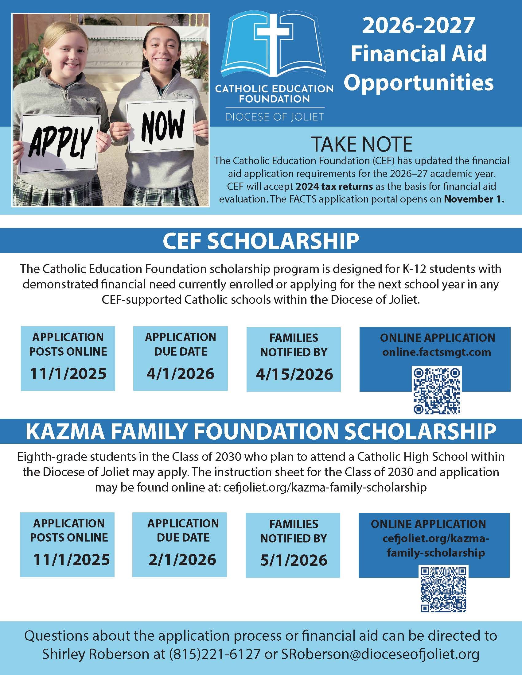 The Diocese of Joliet, through the Catholic Education Foundation (CEF), allocates funds to help children with financial need attend Catholic school. The program is open to K-12 students currently enrolled or applying for the next school year in any CEF-supported Catholic school within the Diocese of Joliet with demonstrated financial need. The standard CEF scholarship is $1,000 per student. Scholarships are awarded annually, and applications are taken from January 1, 2025 – April 1, 2025. Please us the link below to apply through the Diocese of Joliet.
